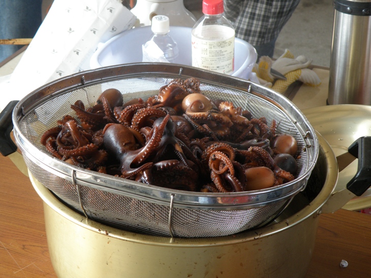 獲れたタコは50匹以上。例年よりもたくさん獲れ、サイズも大きかったそうです。早速港でタコを調理。茹で上がって真っ赤になったタコたち。