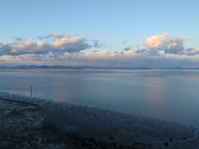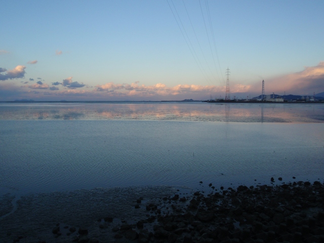 これも今年の1月に撮影した写真。河口から沖に広がる干潟を撮影したもの。河口干潟だけでなく、河口の沖にも広大な干潟が干出します。このときは夕方で干潟の写った夕焼け空の色が綺麗でした。この時期河口沖にはたくさんの海苔ひびが立てられていました。