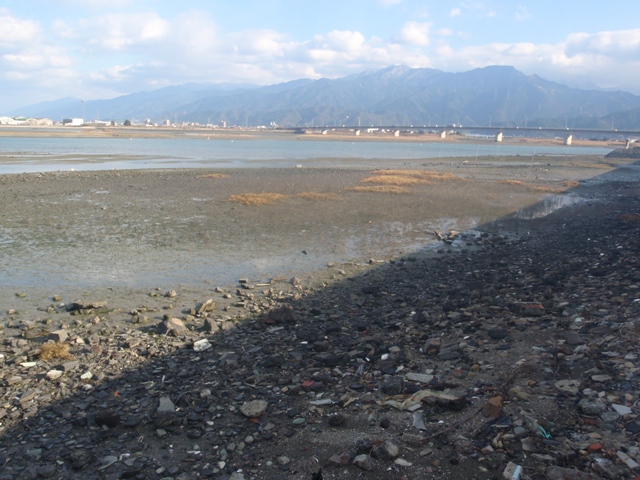 これは今年の1月に訪れた際の同じ場所から撮影した写真。驚くことは、河口部の干潟は冬の昼間の干潮(一般的にはあまり干潟が引かない)でも春の大潮と同じぐらいかなりの面積の干潟が干出しているということ。ズグロカモメが多く、ハマシギ・シロチドリの群れやクロツラヘラサギも見れました。