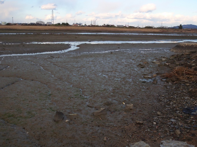 これは昨年1月に河口から上流側を撮影したもの。汽水域にもずっと砂泥から泥質の干潟が広がります。塩生植物群落も見られます。