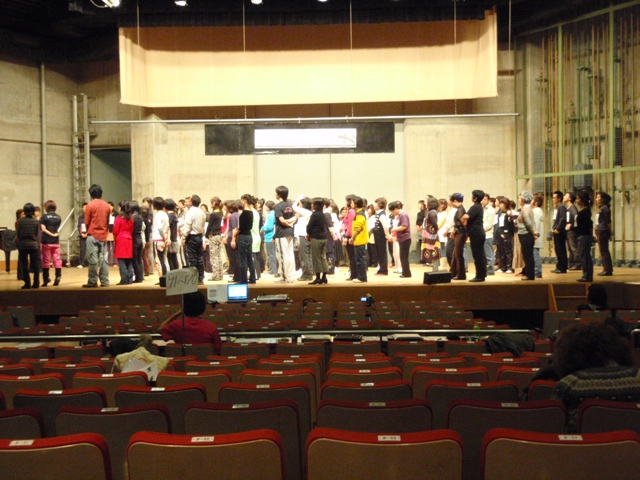応募者130名を超える中で、全体でのダンスと発声練習(写真)の後に、一人2分間ずつ自己アピールの時間がありました。