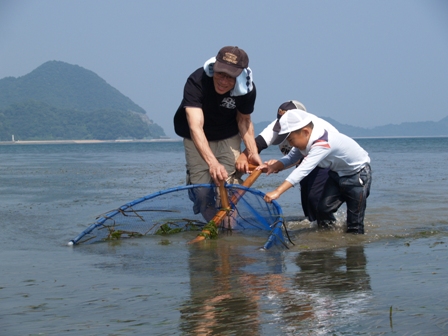 押し網という漁法は、アマモ場がたくさんあったことはいたるところで行われていた。それがいつの頃からか失われてしまっていた。その漁法を、地元の人に聞き取り、復活させた。押し網をするとアマモ場ではたくさんの生き物を捕まえることができる。タツノオトシゴ・ヨウジウオ・メバル・カサゴ・ハオコゼ・エビ・カニ・タコとても楽しい。